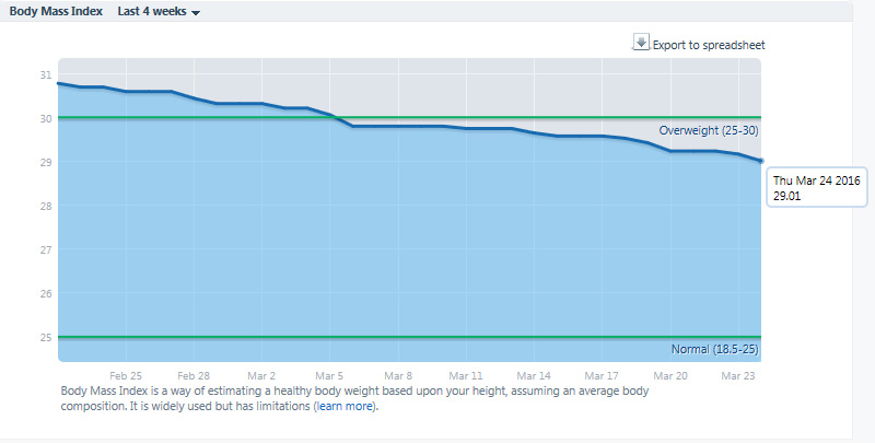 3rd week of 20 pounds marathon is over the hill. Eight pounds are off. My BMI is officially 2 percent down from 31 percent to 29. Does not sound like much right, 2 percent? But these two points have brought me down from the group with a scary name “Obese” to the group called “Overweight”. And as per today there are no more than 4 points between me and the group called “Normal”. LOL